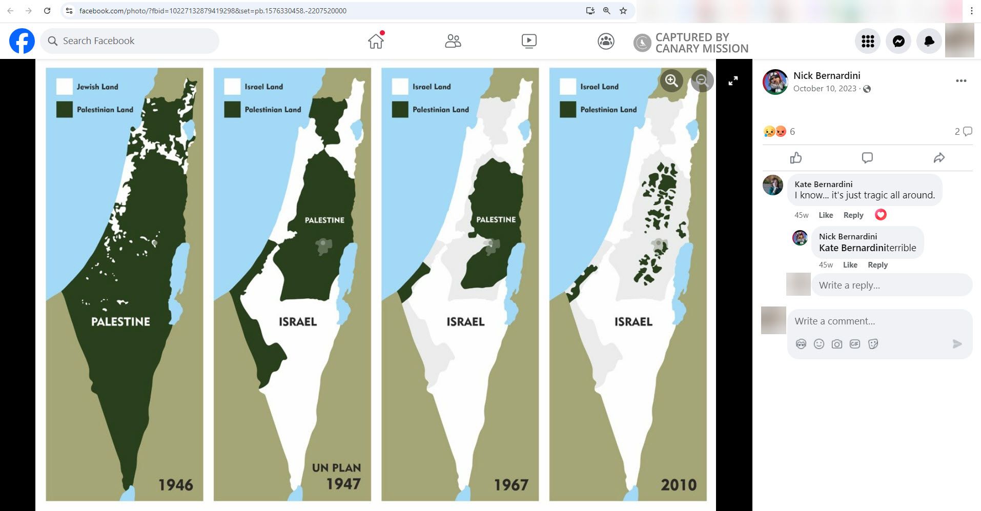 On October 10, 2023, three days after Hamas terrorists committed their atrocities against Israelis, Bernardini shared on Facebook a series of maps popular among anti-Israel activists.The maps claim that lands once controlled by Britain, Egypt and Jordan as autonomous “Palestinian land” were purportedly stolen by Israel. In February 2016, publisher McGraw-Hill Education recalled copies of a college textbook containing the fraudulent maps. In October 2015, American cable news network MSNBC apologized for airing a similar series of maps and retracted them.