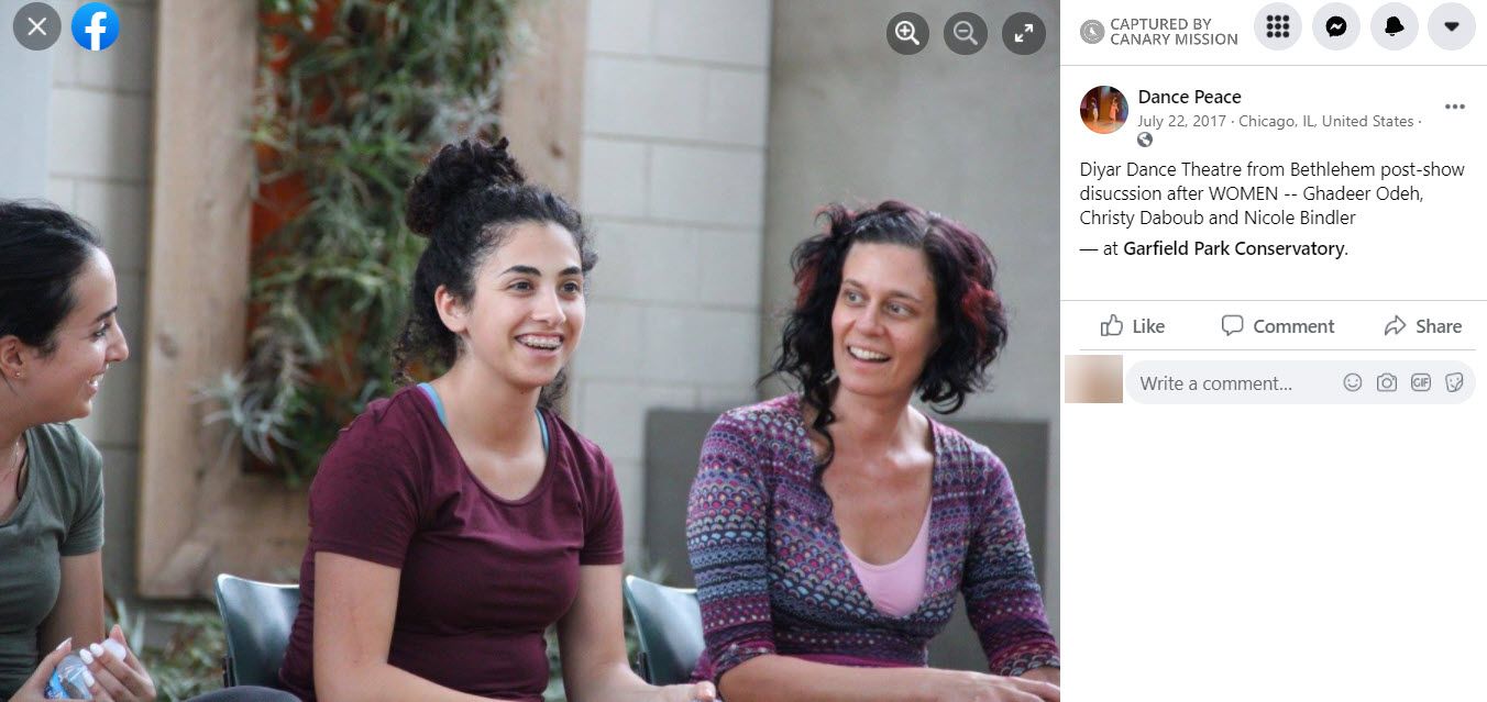 On June 20, 2021, Bindler commented on an article promoting BDS that she shared to Facebook: “... I hope readers take time to fully absorb all the information you're sharing about… the case for cultural boycott of Israeli state-funded artists...Thanks for all your work to bring these issues to light, and thanks to thINKingDANCE for publishing it!”On January 31, 2014, Bindler wrote on Facebook: “Omar Barghouti rocks!” Bindler’s post linked to an article promoting BDS written by Barghouti.