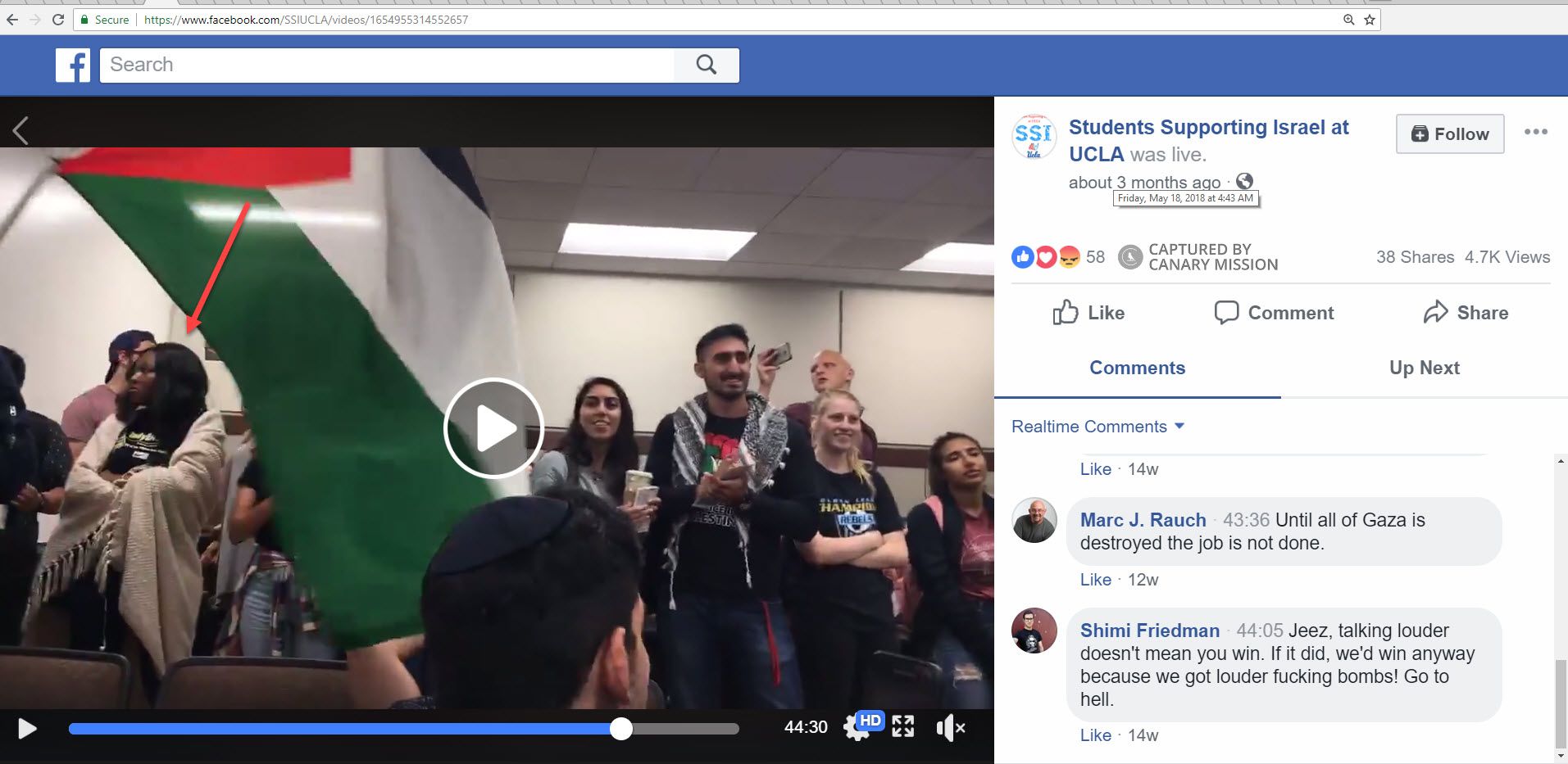 On May 17, 2018, Stephens [00:43:34] and SJP UCLA activists and affiliates disrupted [00:00:47] an event hosted by Students Supporting Israel (SSI) on the UCLA campus. The event, titled "Indigenous People Unite," provided a forum for Jewish, Kurdish, and Armenian indigenous communities “to share the stories of their people.”Approximately 41 minutes into the lecture, SJP at UCLA members and Antifa activists invaded [00:41:16] the forum. Protester Armen Adamian walked toward the speakers and tore the Armenian flag off the wall. Adamian then threw [00:41:24] the Armenian panelist’s notes off the speakers’ table and leaned over him.
