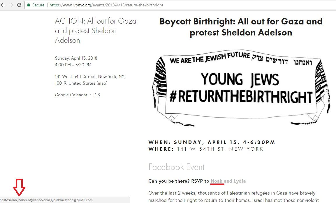 On April 15, 2018, Habeeb co-hosted a “Return the Birthright” campaign event, titled “Boycott Birthright: All out for Gaza and protest Sheldon Adelson.”The protest targeted the Taglit Birthright gala in New York City.
