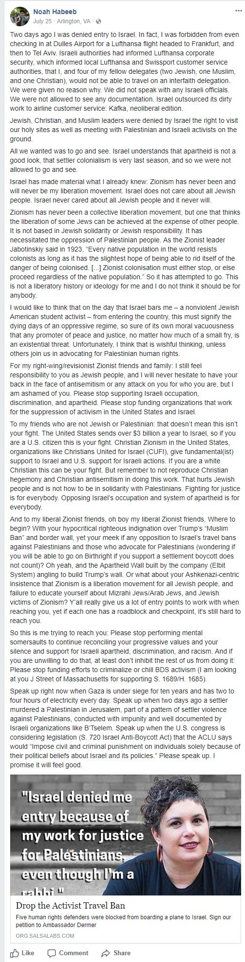 Habeeb’s September 6, 2017 testimonial was an abridged version of a July 25, 2017 Facebook post, in which he claimed that “Israel does not care about all Jewish people. Israel never cared about all Jewish people and it never will.”