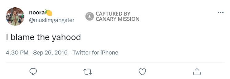 On September 26, 2016, Aldulaimi tweeted: “I blame the yahood [Jews].”Hatred of Israel