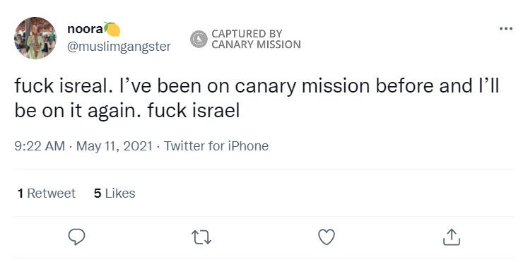 On May 11, 2021, Aldulaimi tweeted: “f**k isreal. I’ve been on canary mission before and I’ll be on it again. f**k israel.”On May 15, 2021, Aldulaimi tweeted: “death to isreal.”