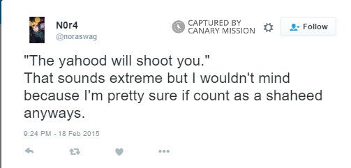 On February 18, 2015, Abushaaban tweeted: “‘The yahood [Jews] will shoot you.’ That sounds extreme but I wouldn't mind because I'm pretty sure if count as a shaheed [martyr] anyways.”On July 12, 2014, Abushaaban tweeted a screenshot of a Facebook status that read: “Palestinians grew up wanting nothing but dying as martyrs. So whether Palestinians win this worldly war or not, they’re the winners.”