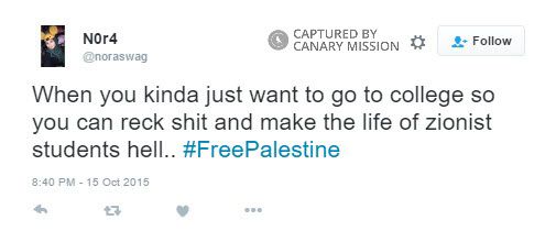 On October 15, 2015, Abushaaban tweeted: “When you kinda just want to go to college so you can reck s**t and make the life of zionist students hell.. #FreePalestine.”
