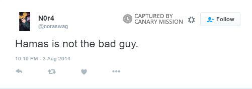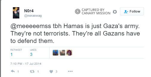 On August 3, 2014, during Israel’s Operation Protective Edge (OPE) against Hamas, Abushaaban tweeted: “Hamas is not the bad guy.”On July 17, 2014, Abushaaban tweeted: “tbh Hamas is just Gaza's army. They're not terrorists.”