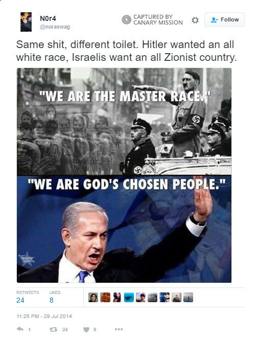 On July 29, 2014, Abushaaban tweeted: “Same s**t, different toilet. Hitler wanted an all white race, Israelis want an all Zionist country.”