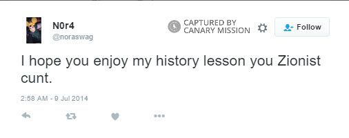 On July 9, 2014, Abushaaban tweeted: “I hope you enjoy my history lesson, you Zionist c**t.”