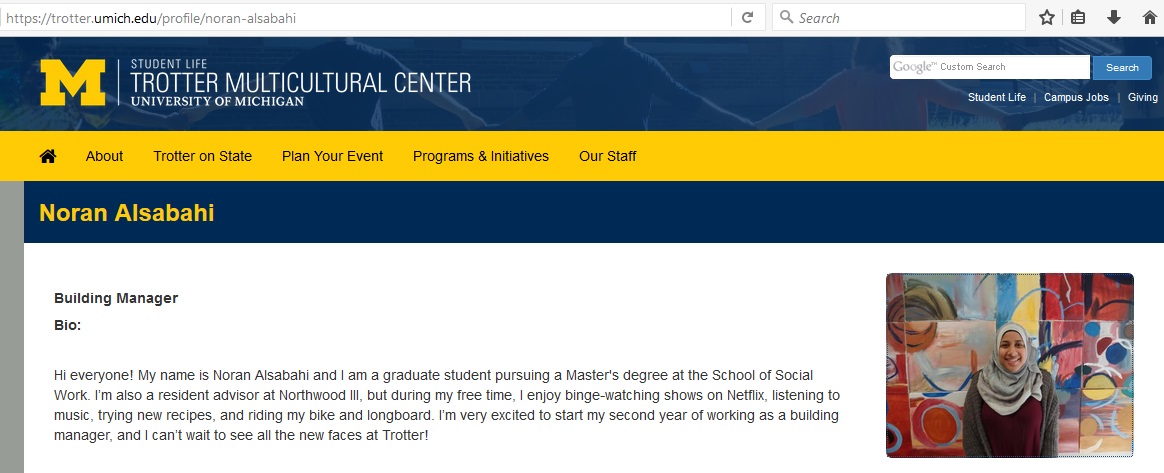 Noran Alsabahi is the former outreach chair ofStudents Allied for Freedom and Equality (SAFE), a chapter of Students for Justice in Palestine (SJP) at the University of Michigan-Ann Arbor (UM Ann Arbor). In 2016, Alsabahi graduated with a bachelor’s degree in Psychology.