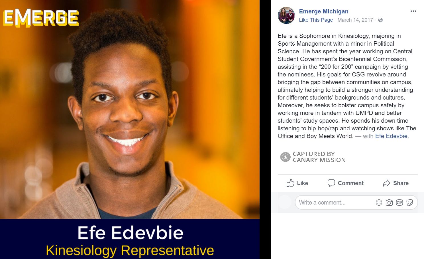 Okpalefe Edevbie [Efe Edevbie] voted for a secret ballot that allowed an anti-Israel Boycott, Divestment, Sanctions (BDS) resolution to pass, as a student representative in the University of Michigan, Ann Arbor (UM Ann Arbor) Central Student Government (CSG), in 2017.As of April 2018, Edevbie’s LinkedIn page said he was the chair of the CSG Executive Nominations Committee at the time of BDS vote.