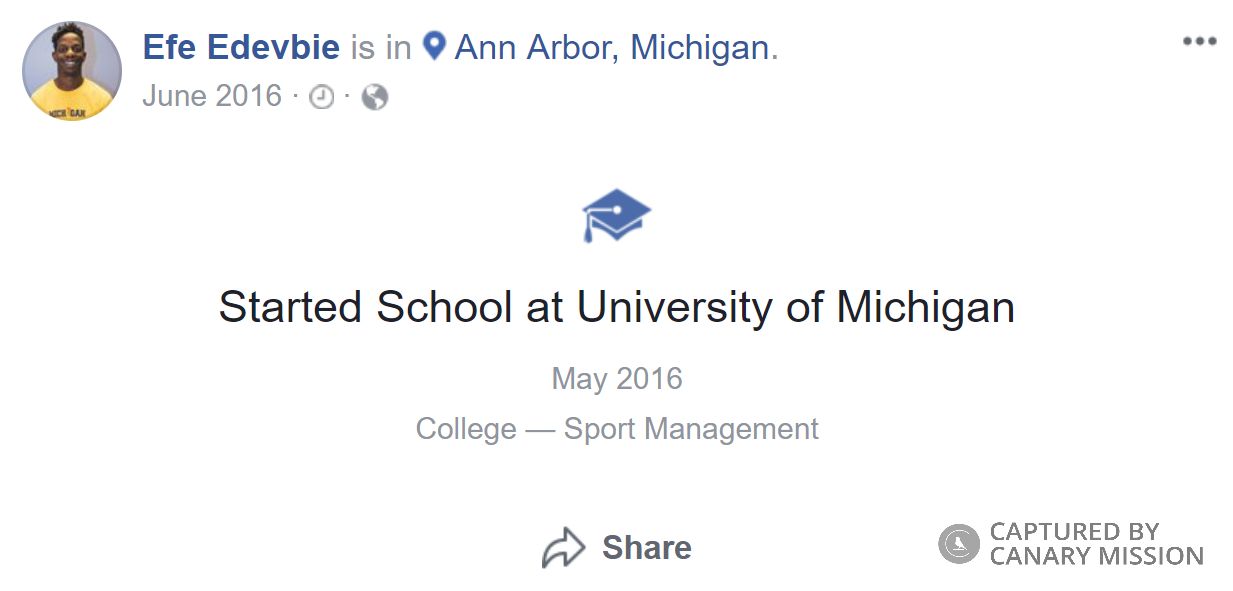 Edevbie’s LinkedIn page also said he was studying Sport Management and slated to graduate from UM Ann Arbor in 2019. He also studied Marketing at Wayne State University (WSU) in 2015-2016. He is a sports writer for the Michigan Daily.
