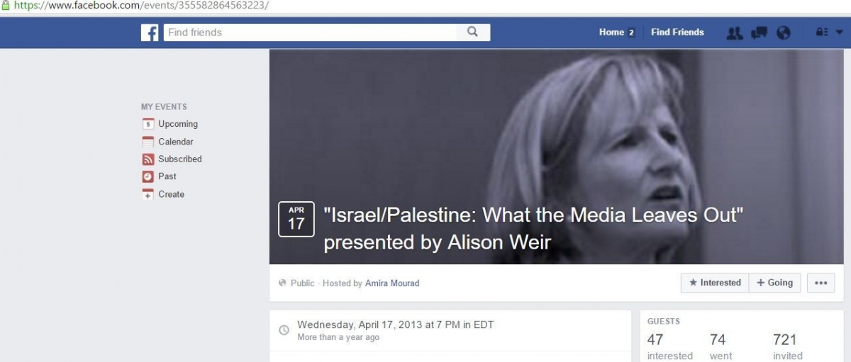 On April 18, 2013, SJP UTK hosted a speaking event featuring anti-Israel agitator Alison Weir.
