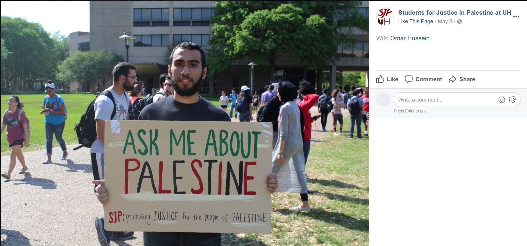 On May 8, 2017, Hussein held a sign at SJP UH’s 2017 IAW. The sign said: “Ask me about Palestine.” Another display at SJP UH’s IAW read: “Let’s Talk Facts. Israel kills more children per capita than any nation or terrorist organization in the world.”