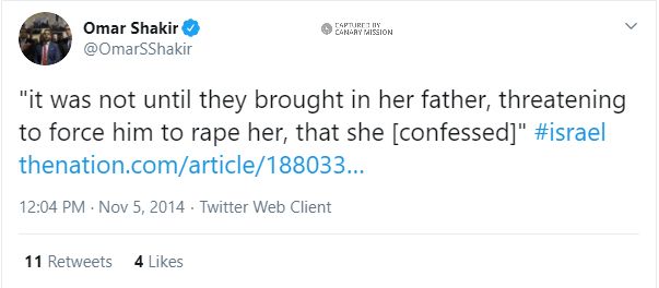 On April 17, 2017, Shakir tweeted: “Marwan Barghouti in @nytimes on why 100s of prisoners in Israeli jails are on hunger strike #PalestinianPrisonersDay”