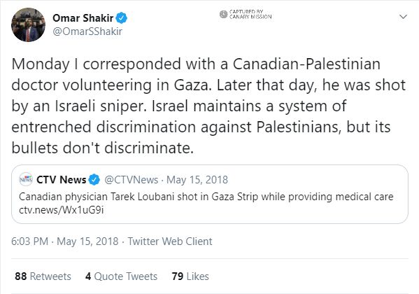Also on May 15, 2018, Shakir tweeted: “... Israel maintains a system of entrenched discrimination against Palestinians, but its bullets don't discriminate.”