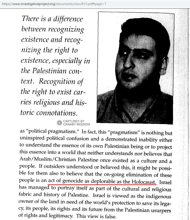 In 1999, Abuirshaid published an article where he said [p.2] that Israel has carried out an “act of genocide as deplorable as the Holocaust.”