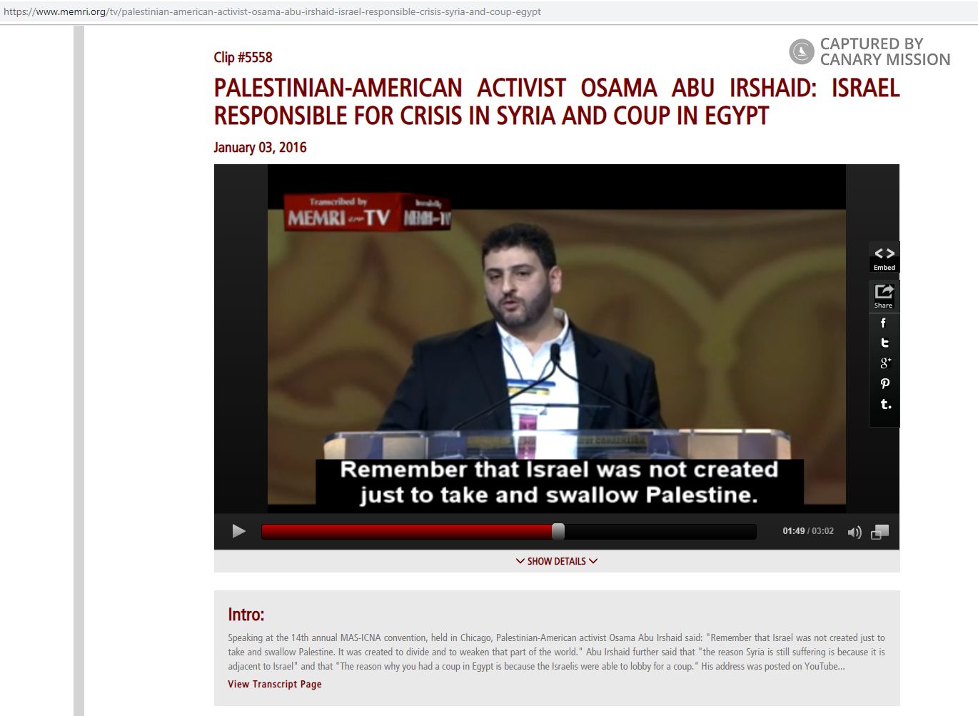 On January 3, 2016, Abuirshaid spoke [00:00:15] at the 2015 MAS-ICNA conference and blamed [00:00:35] Israel for turmoil throughout the entire Middle East, including Syria and Egypt.