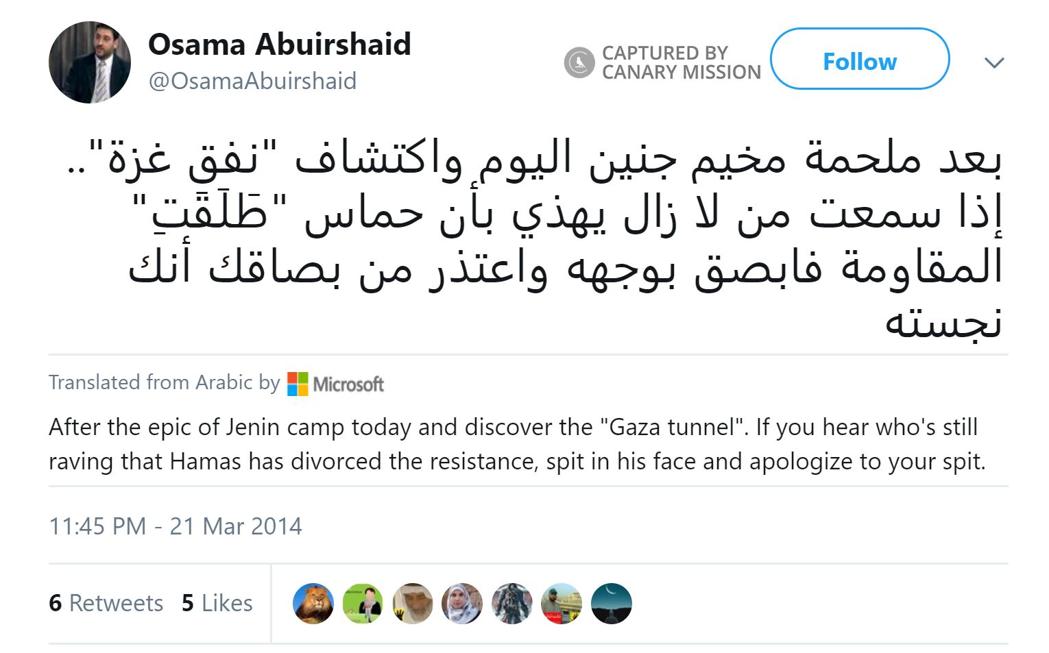 On March 22, 2014, Abuirshaid tweeted about Israel discovering a Hamas tunnel from Gaza and Israeli soldiers who exchanged fire with Hamas terrorists in Jenin.Abuirshaid’s tweet said: “بعد ملحمة مخيم جنين اليوم واكتشاف "نفق غزة".. إذا سمعت من لا زال يهذي بأن حماس "طَلَقَتِ" المقاومة فابصق بوجهه واعتذر من بصاقك أنك نجسته [After the slaughter of Jenin today and the discovery of the ‘Gaza tunnel’.. if you heard someone who continues to ramble about Hamas ‘divorcing’ the resistance, then spit in his face and apologize to your spit for defiling it].”