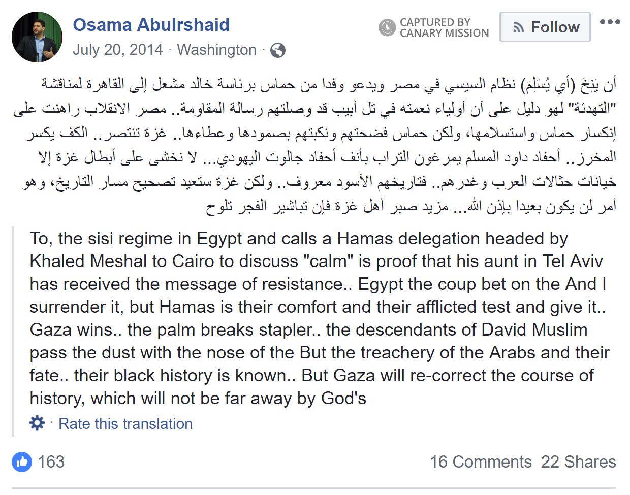 On July 8, 2014, Abuirshaid posted on Facebook: “مقاتلو القسام يقتحمون القواعد العسكرية الصهيونية في الداخل الفلسطيني المحتل.. حماس تمطر الدولة العبرية بالصواريخ وتفرض حظر تجوال على حركة قطعان المحتلين في مدننا المحتلة. [Al-Qassam fighters storm the Zionist military bases inside occupied Palestine. Hamas is raining the Hebrew state with rockets and imposing a curfew upon the movement of the occupying herds in our occupied cities.]”
