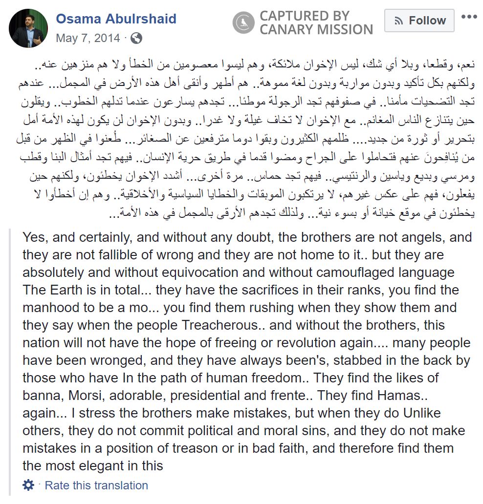 On March 6, 2013, Abuirshaid posted on Facebook: “الإخوان، كمجموعة، لا كأفراد بالضرورة، هم خيرة الناس تربية وأخلاقا وتضحية وفداء وانتماء لقضايا شعوبهم وأمتهم. [The Brotherhood, as a group, not necessarily as individuals, are the best of people by the way they were brought up, morals, sacrifice, belonging to the causes of their people and nation].”