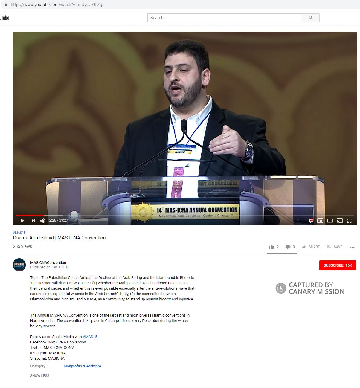 On January 3, 2016, Abuirshaid spoke [00:00:09] at a MAS-ICNA convention and praised [00:23:33] “Palestinian youth” who “decided to take things into their own hands” and [00:24:53] “started the new intifada, defending al Aqsa.”