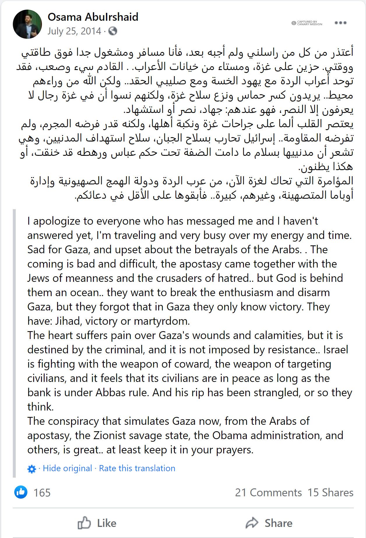 On July 25, 2014, Abuirshaid wrote a Facebook post during Israel’s Operation Protective Edge (OPE) against Hamas, where he referred to Israel as the “يهود الخسة [despicable Jews].” He also implied that western powers like America who oppose Hamas are “صليبي الحقد [hating Crusaders].”