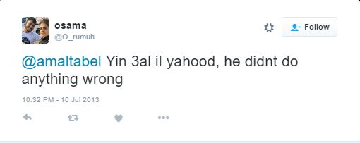 On July 10, 2013, Aburumuh tweeted: "Yin 3al il yahood [Curse the Jews], he didnt do anything wrong."