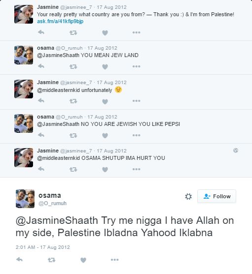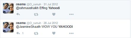 On July 28, 2012, Aburumuh tweeted: "@JasmineShaath @aayakhalaf JEW GO AWAY."