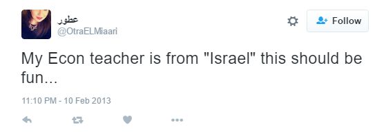 On Feb 10, 2013, El-Miaari tweeted "My Econ teacher is from "Israel" this should be fun.."