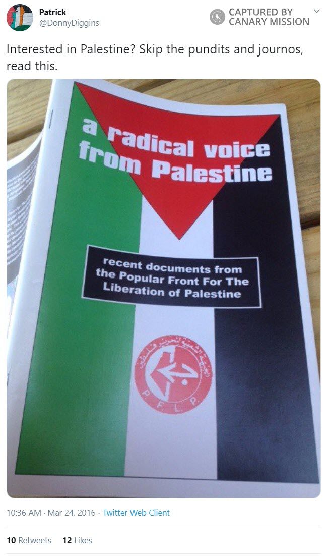 On March 19, 2018, Higgins wrote in a post on his blog, titled: “The Tropes of Anti-Anti Imperialism, Part 3: Palestine and the War on Syria,” that Hamas: “actions against Israel serve the ends of justice. As refugees in their own land, Hamas fighters’ armed rebellion not only amounts to self-defense from the racist aggression manifested in Israel’s very existence, but also plays a role in the liberation of the Palestinian people as a whole from colonialism.”On April 19, 2016, in a post on his blog, titled: “Victims of Propaganda: In Defense of the Palestinian Left,” Higgins lauded the PFLP as an example of Palestinian “voices of resilience.” He went on to claim that the PFLP and Hezbollah were “victims of propaganda” and that “To defend their honor is exactly the kind of job a radical must embrace.”