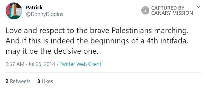 On July 25, 2014, Higgins tweeted: “Love and respect to the brave Palestinians marching. And if this is indeed the beginnings of a 4th intifada, may it be the decisive one.”