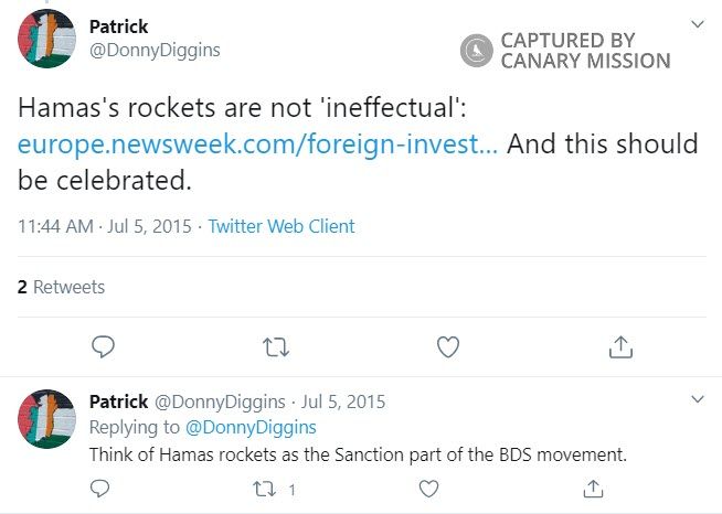 On July 5, 2015, Higgins tweeted: “Hamas's rockets are not 'ineffectual': http://europe.newsweek.com/foreign-investment-israel-slashed-by-half-329269 And this should be celebrated.”