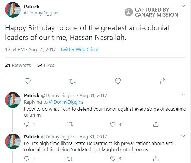 On August 31, 2017, Higgins tweeted: “Happy Birthday to one of the greatest anti-colonial leaders of our time, Hassan Nasrallah.”