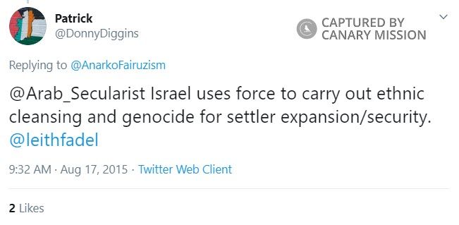 On August 17, 2015, Higgins tweeted: “Israel uses force to carry out ethnic cleansing and genocide for settler expansion/security.”
