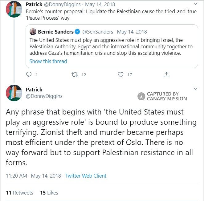 On September 11, 2019, Higgins tweeted: “Wholesome footage of Palestinian resistance rockets forcing Netanyahu to flee his own campaign speech.”On May 14, 2018, Higgins tweeted: “Zionist theft and murder became perhaps most efficient under the pretext of Oslo. There is no way forward but to support Palestinian resistance in all forms.”