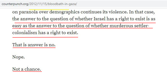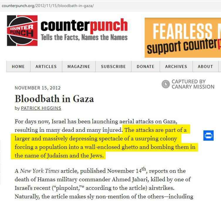 On November 15, 2012, during Israel’s OPD, Higgins wrote an article on CounterPunch, in which he said: “the answer to the question of whether Israel has a right to exist is as easy as the answer to the question of whether murderous settler-colonialism has a right to exist. That is answer is no. Nope. Not a chance.”Higgins also said in the article that Israel attacked Gaza as part of a “spectacle of a usurping colony forcing a population into a wall-enclosed ghetto and bombing them in the name of Judaism and the Jews.”