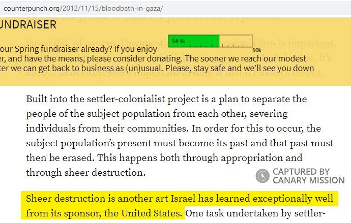 On April 19, 2016, in a post on his blog, titled: “Victims of Propaganda: In Defense of the Palestinian Left,” Higgins wrote that the Palestinians’ “confrontation with imperialism” took “the form of classic settler-colonialism, replete with actual invaders and full-on ethnic cleansing.”