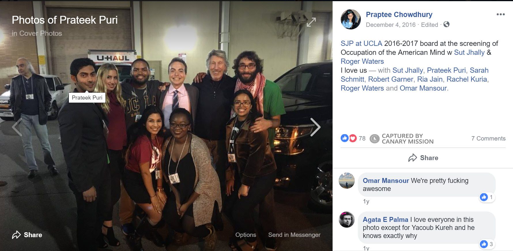 On December 1, 2016, Puri appeared in a photo along with other SJP at UCLA 2016-2017 board members on Facebook, posing together with Jhally and Waters.