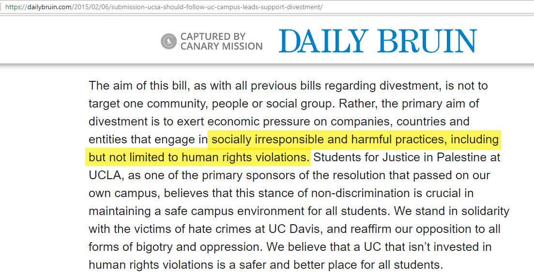 In February 2015, SJP at UCLA pushed BDS beyond the UCLA campus by promoting a divestment resolution to the UC Student Association (UCSA). The resolution also called on the UC Regents to divest from American-based corporations that “violate Palestinian human rights.”