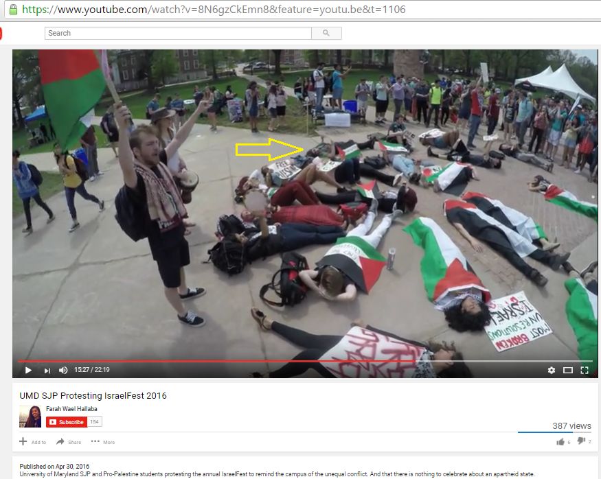 Rachael Boggins participated in an April 2016 “die-in” that disrupted the annual Israel Fest celebration at the University of Maryland, College Park (UMD). The die-in was organized by Students for Justice in Palestine (SJP) at UMD (SJP UMD).On March 7, 2017, Boggins listed herself on Facebook as having attended an SJP UMD event that promoted the Boycott, Divestment, Sanctions (BDS) movement.