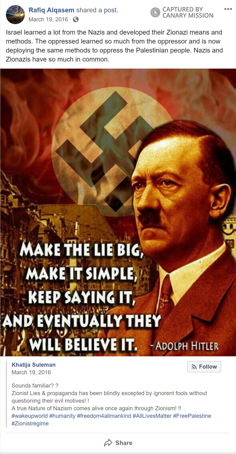 The text of the post Alqasem shared said: “Sounds familiar? ? Zionist Lies & propaganda has been blindly excepted by ignorent fools without questioning their evil motives! [sic] ! A true Nature of Nazism comes alive once again through Zionism! !! #wakeupworld #humanity #freedom4allmankind #AllLivesMatter #FreePalestine#Zionistregime”