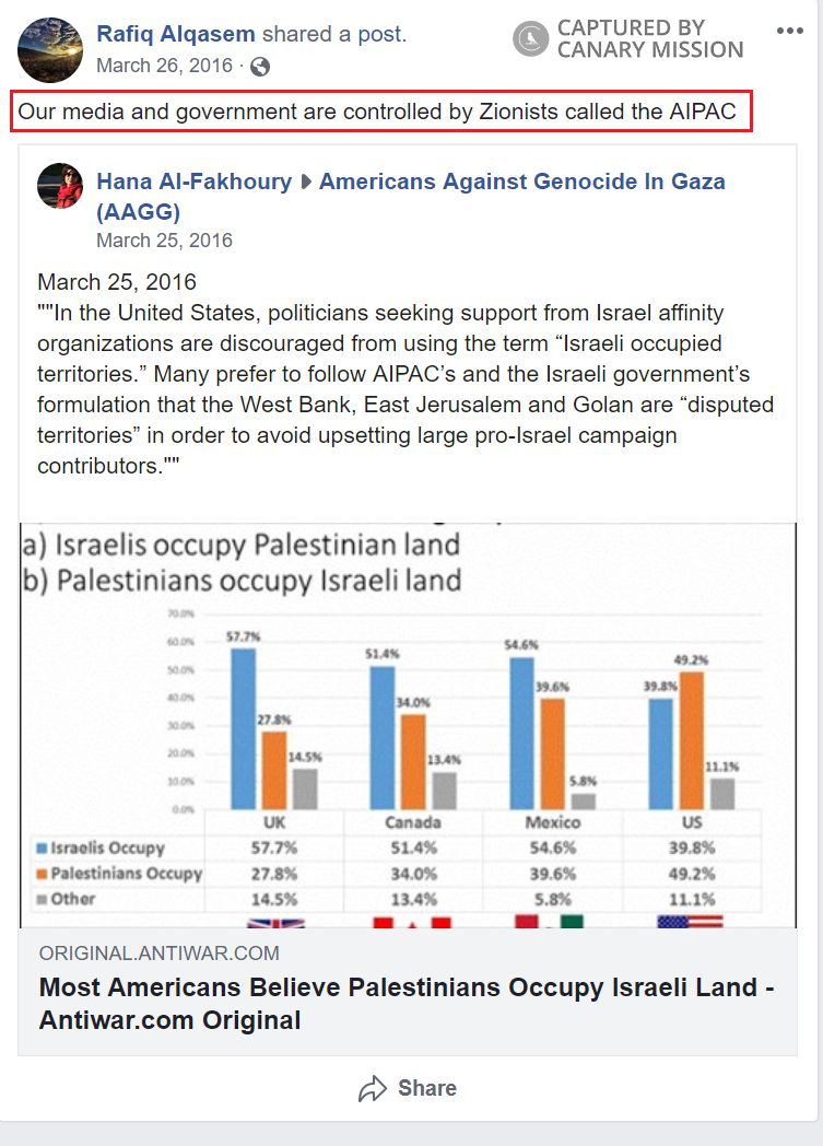 On March 26, 2016, Alqasem posted to Facebook: “Our media and government are controlled by Zionists called the AIPAC.”