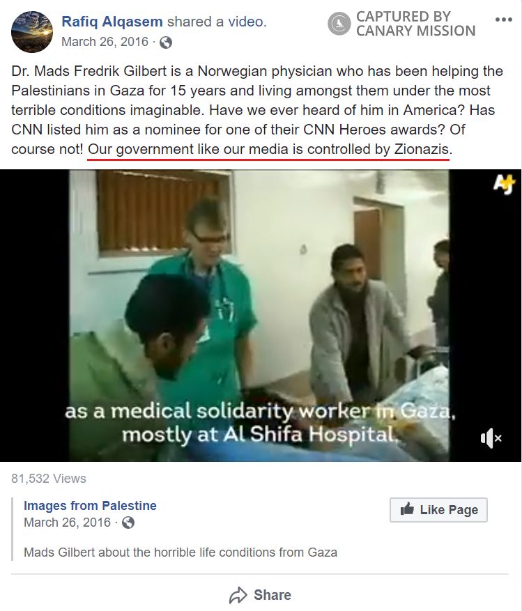 Also on March 26, 2016, Alqasem wrote on Facebook: “Dr. Mads Fredrik Gilbert is a Norwegian physician who has been helping the Palestinians in Gaza for 15 years and living amongst them under the most terrible conditions imaginable. Have we ever heard of him in America? Has CNN listed him as a nominee for one of their CNN Heroes awards? Of course not! Our government like our media is controlled by Zionazis.”