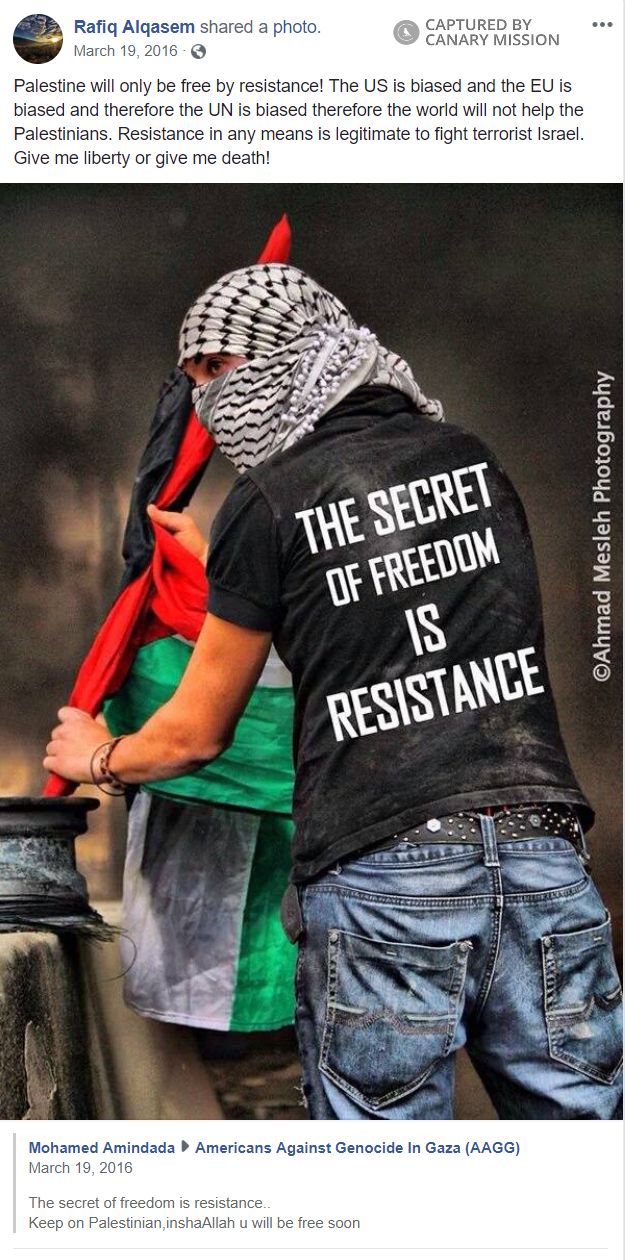 On March 19, 2016, Alqasem shared a Facebook photo of a keffiyeh-masked Palestinian protester, on which he commented: “Palestine will only be free by resistance! The US is biased and the EU is biased and therefore the UN is biased therefore the world will not help the Palestinians. Resistance in any means is legitimate to fight terrorist Israel. Give me liberty or give me death!”On March 5, 2016, Alqasem shared a Facebook image showing a hand holding a large knife. Text in the image justified Palestinian attacks against Israelis, concluding: “DON’T BLAME THE VICTIMS.” The text of the post said: “If I could..I would use a GUN.” The image referred to a wave of violence in Israel known as the “knife intifada.”