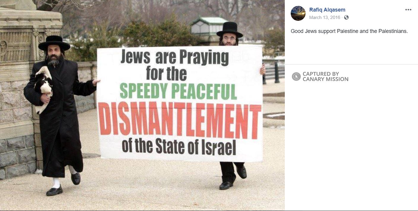 On March 13, 2016, Alqasem posted on Facebook: “Good Jews support Palestine and the Palestinians.”