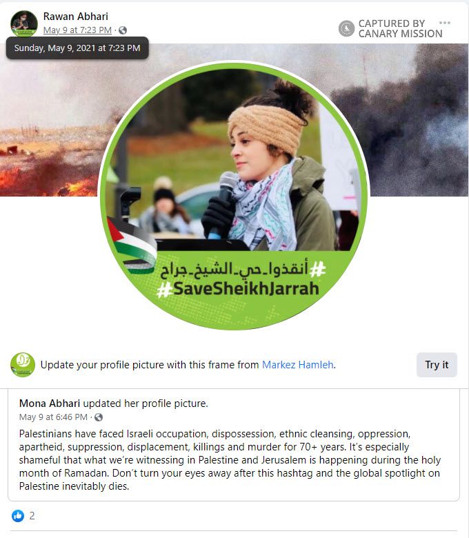 On May 9, 2021, Abhari shared a post to Facebook that accused Israel of “ethnic cleansing, oppression, apartheid… ”