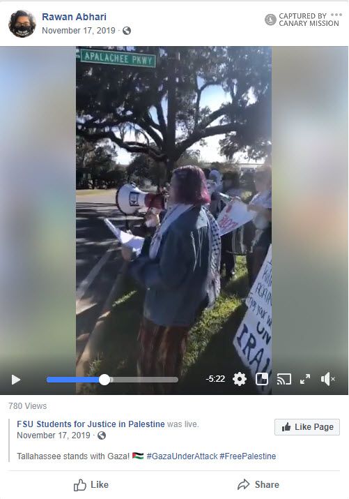 On November 17, 2019, Abhari shared a video to Facebook of an FSU SJP protest against Israeli airstrikes on Gaza titled “Emergency Demo: #GazaUnderAttack.”