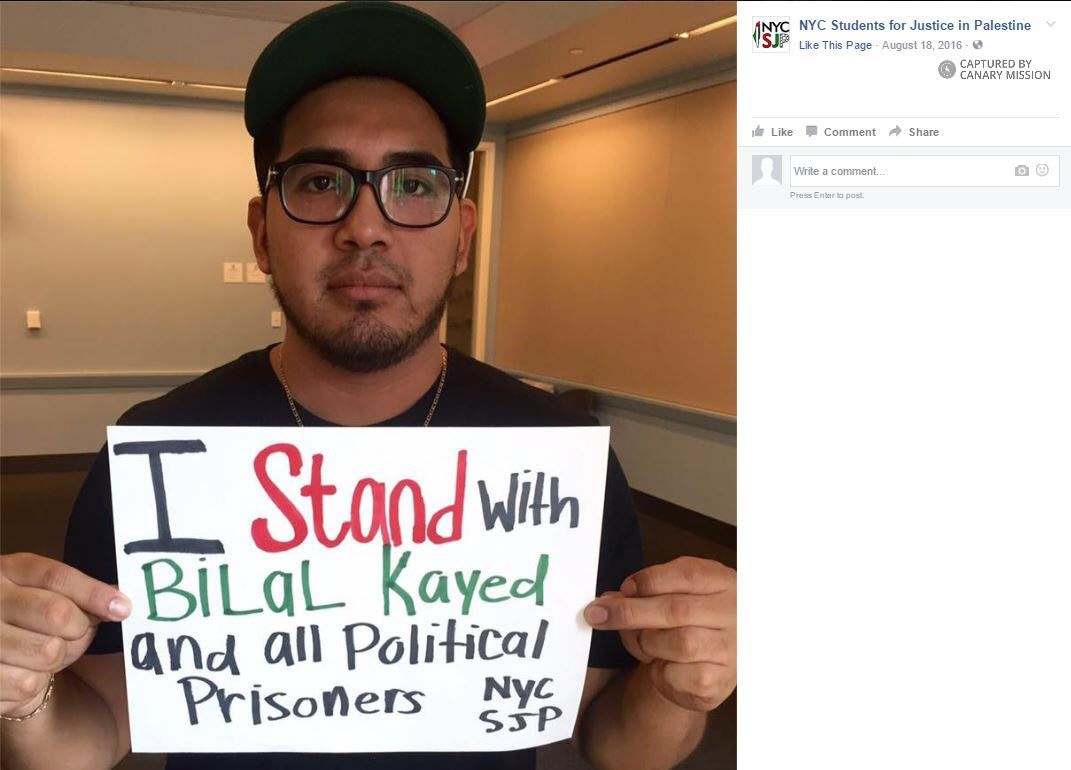 On January 14, 2017, Valentin was cited by a user on Facebook for posting a graphic from the terror group Popular Front for the Liberation of Palestine (PFLP) on Facebook. The graphic featured keffiyeh-masked Palestinians, holding assault weapons with text reading, in Arabic and English: “LET THE INTIFADA PAVE THE WAY FOR THE PEOPLE’S WAR.”On August 18, 2016, Valentin featured in a photo shared on Facebook by NYC SJP, holding a sign that read: “I Stand with Bilal Kayed and all Political Prisoners NYC SJP.”
