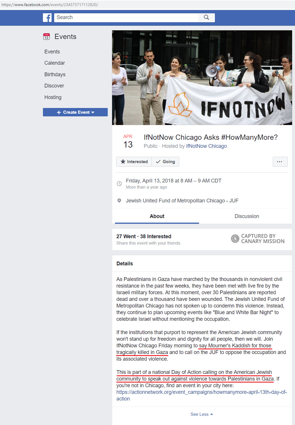 Oliver indicated on Facebook that she “went” to an INN Chicago event on May 18, 2018, called: “March of Return: Young Jews Mourn and Condemn Israeli Killings of Palestinians.” The Facebook event page claimed that “Israeli forces killed over 50 Palestinians in Gaza” on May 14, 2018.