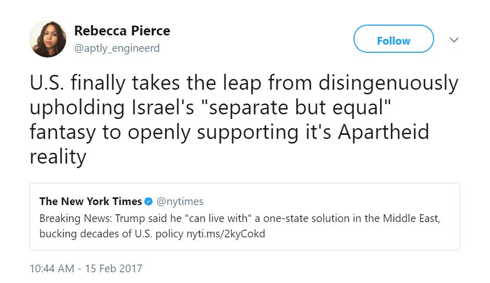 On February 15, 2017, Pierce tweeted: “U.S. finally takes the leap from disingenuously upholding Israel's ‘separate but equal’ fantasy to openly supporting it's Apartheid reality.”On November 10, 2016, Pierce tweeted: “Israeli Apartheid *includes* racism directed at Black, Arab, Kurdish and other POC Jews. Truly dismantling it means racial justice for all.”